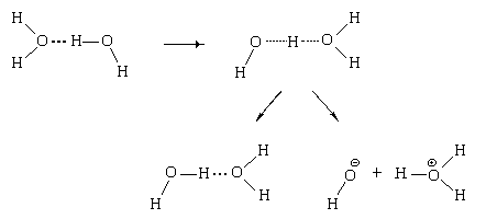 За счет тепловых колебаний атом водорода, образующий водородную связь, может на мгновение занять промежуточное положение между атомами кислорода. Из частицы с таким атомом водорода с равной вероятностью могут образоваться как исходные молекулы воды, связанные водородными связями, так и два иона: гидроксид-ион и ион оксония: