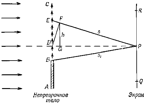 Предположим, что свет приходит из бесконечности, попадает на предмет и отбрасывает от него тень. На фиг. 30.7 изображен экран, на который свет отбрасывает тень от предмета АВ, причем источник света удален на расстояние, много большее длины волны.