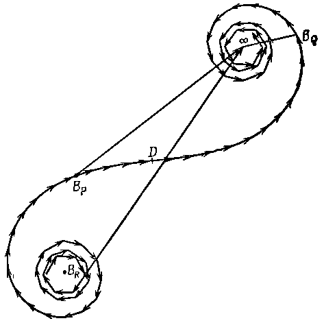 Весь вклад от области над Вр дается спиральной кривой. Если бы суммирование заканчивалось в некоторой точке, то полная амплитуда представилась бы вектором от Вр до этой точки; в нашем случае суммирование ведется до бесконечности, так что искомая амплитуда есть вектор Вр?. Точка на кривой, соответствующая точке Вр на предмете, зависит от положения точки Р, потому что точка D кривой (точка перегиба) всегда относится к выбранной точке Р. Следовательно, в зависимости от положения Р над В начальная точка, откуда проводится вектор, попадает в разные места нижней спирали, и результирующий вектор Вр? имеет многочисленные максимумы и минимумы (фиг. 30.9).