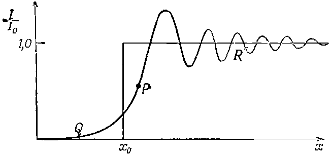 Фиг. 30.9, Ход интенсивности вблизи края тени. Геометрический край menu находится в точке х0.