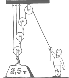 Применение блоков, как известно, позволяет с меньшими усилиями поднимать большие грузы. Насколько меньшими? Давайте посчитаем. Берем самую простую систему – двухблочную (см. рисунок – представьте, что там только два блока, неподвижный, прибитый к балке и свободный второй). Сдвинем веревку на l, насколько поднимется груз? Очевидно, на l/2. Работа по подъему груза есть F1 l = F2 l/2 (последнее равенство – просто одна из форм записи закона сохранения энергии; здесь F1 – сила, которую прикладывает человек, F2 – сила, с которой притягивается к земле груз, т. е. попросту вес груза). Сократив обе стороны равенства на l, получим F1 = F2/2. Рассмотрим теперь систему из трех блоков. Рассуждая аналогичным образом, выводим F1 = F2/4 и, обобщая на случай n блоков, – F1 = F2/2n?1. Или, переписав эту формулу, 2n?1 = F2/F1 = 2500/20 = 125. Вспоминая, что 128 = 27, а 125 – это почти 128, находим n – 1 = 7, n = 8 – восьми блоков будет достаточно, чтобы поднять груз массой 2,5 т, приложив усилие в 20 кг (и даже немножечко меньшее).