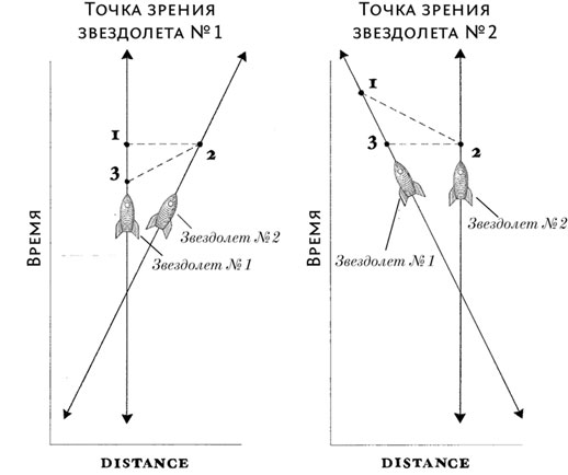 Мы уже видели, что с точки зрения движущихся наблюдателей расстояния меняются, однако сочетание пространства и времени должно оставаться одинаковым для всех. Это означает, что время между передачей и приемом объективно не может быть равно нулю.