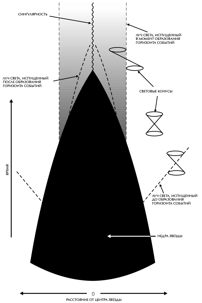 Согласно Оппенгеймеру, дело обстоит следующим образом. Под действием гравитационного поля звезды траектории лучей света в пространстве-времени искривляются – в отсутствие звезды траектории были бы иными. Световые конусы, указывающие траектории, по которым следуют в пространстве-времени вспышки света, излученного из вершин этих конусов, слегка искривляются внутрь около поверхности звезды. Такой эффект наблюдается во время солнечного затмения, когда искривляются лучи света далеких звезд. По мере сжатия звезды напряженность гравитационного поля на ее поверхности возрастает, и световые конусы все сильнее искривляются к звезде. Из-за этого излучению звезды становится все труднее покинуть ее, и для удаленного наблюдателя ее свечение выглядит все более тусклым и красным. Наконец, когда звезда сожмется до определенного критического радиуса, гравитационное поле на ее поверхности окажется чрезвычайно сильным и выгнет траектории лучей света так, что те больше не смогут покинуть звезду (рис. 6.1). Согласно теории относительности, ничто не может двигаться быстрее скорости света. И раз свет не может покинуть звезду, это также невозможно и для любого другого объекта – он неминуемо будет втянут обратно гравитационным полем. Таким образом в результате этих событий образуется область пространства-времени, из которой ничто не может выйти – и достичь удаленного наблюдателя. Эта область называется черной дырой. Внешняя граница черной дыры называется горизонтом событий, и она совпадает с траекториями лучей света, которые только что тщетно пытались покинуть эту область.
