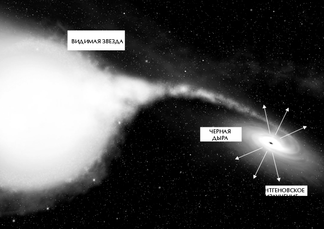 Но как обнаружить черную дыру, если она по определению ничего не излучает? Это немного напоминает поиски черной кошки в подвале, где хранят уголь. К счастью, способ все же есть. Как отметил еще Джон Мичелл в своей пионерской работе 1783 года, черная дыра продолжает воздействовать на окружающие объекты посредством своего гравитационного поля. Астрономы наблюдали множество систем, в которых две звезды обращаются друг вокруг друга под действием взаимного притяжения. Известны также системы, где видна только одна звезда, которая движется вокруг невидимого спутника. Отсюда, конечно, не следует, что этот спутник обязательно должен быть черной дырой, – это может быть только очень тусклая звезда, неразличимая из-за слабого блеска. Но некоторые из этих систем, вроде системы Лебедь X-1 (рис. 6.2), являются также мощными источниками рентгеновского излучения. Лучшее объяснение этого явления состоит в том, что мы имеем дело с веществом, истекающим с поверхности видимой звезды. Падая на невидимый спутник, вещество перемещается по спиральной траектории (совсем как вода, убегающая из ванны), сильно нагревается и испускает рентгеновское излучение (рис. 6.3). Этот механизм сработает, только если невидимый объект очень мал – как белый карлик, нейтронная звезда или черная дыра. На основании анализа орбиты видимой звезды можно оценить минимально возможную массу невидимого спутника. В случае системы Лебедь X-1 она составляет шесть масс Солнца, что, согласно расчетам Чандрасекара, слишком много для белого карлика. Эта масса также превышает предельную массу нейтронной звезды, и следовательно, похоже, что мы имеем дело с черной дырой.