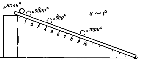 Будем отсчитывать удары пульса в то время, пока шарик катится вниз: «Один... два... три... четыре... пять... шесть... семь... восемь...». Пусть кто-нибудь отмечает положение шарика на каждый счет. Теперь можно измерить расстояние, которое шарик прошел за один, два, три и т. д. равных интервала времени. Галилей сформулировал результат своих наблюдений следующим образом: если отмечать положения шарика через 1, 2, 3, 4,... единицы времени от начала движения, то окажется, что эти отметки удалены от начального положения пропорционально числам 1, 4, 9,16, ... . Сейчас мы сказали бы, что расстояние пропорционально квадрату времени: