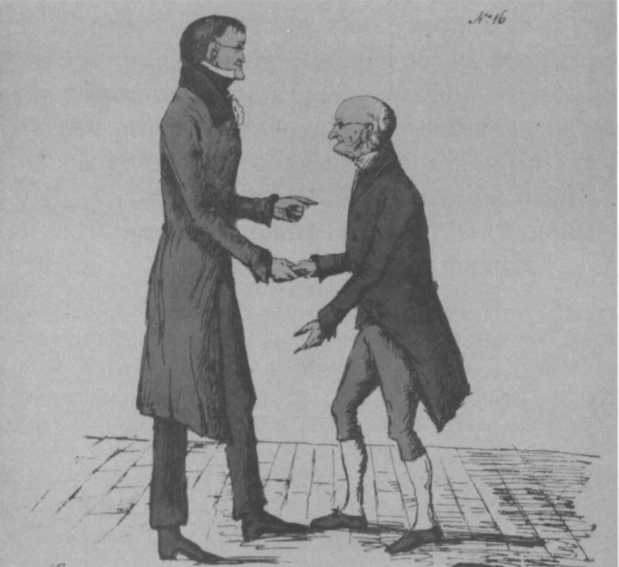 Литография 1833 года. Карикатура изображает Дальтона (справа), благодарящего голландского физика Герхарда Молля (1785-1838) за публикацию памфлета в защиту английской науки.