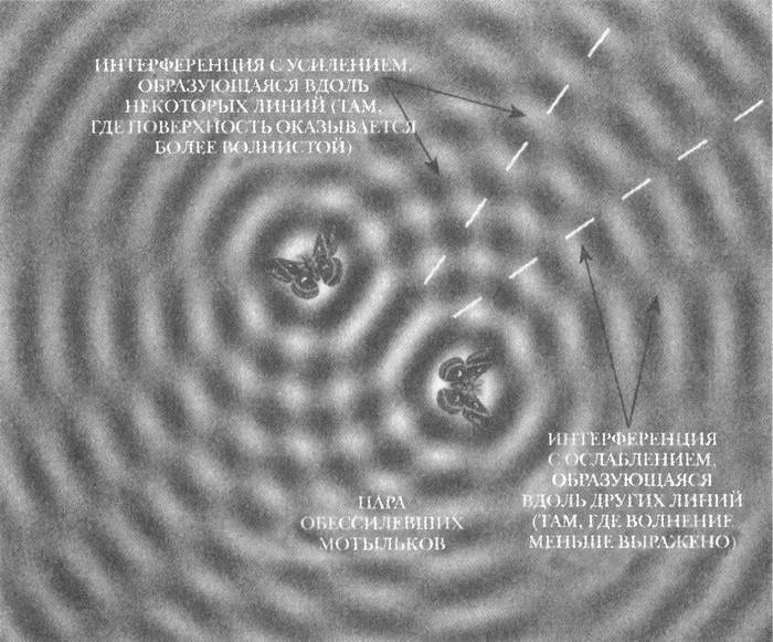 Линии относительно спокойной воды проходят там, где гребни волн от одного мотылька совпадают с подошвами волн от другого мотылька. Таким образом, не совпадая по фазе, волны друг друга нейтрализуют, то есть происходит интерференция с ослаблением. Между ними проходят линии гораздо интенсивнее волнующейся водной поверхности — там, где рябь совпадает по фазе, то есть гребни волн от одного мотылька встречаются с гребнями волн от другого мотылька, равно как и подошвы. В данном случае, поскольку волны складываются, имеет место интерференция с усилением. Только в том случае, когда два источника порождают волны одинаковой высоты и с одинаковой частотой, совпадающие по фазе, результатом становится такая вот интерференция по определенной схеме. Думаю, если бы мотыльки взмахивали крыльями с разной скоростью, рисунок на воде был бы совсем другим.