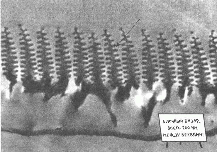 «Ветками» служат небольшие зазубрины вдоль «стволов» — это и есть слои, играющие исключительно важную роль. Расстояние между отдельными «ветками»-зазубринами выдерживается с удивительной точностью — в 200 нм.