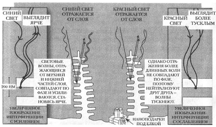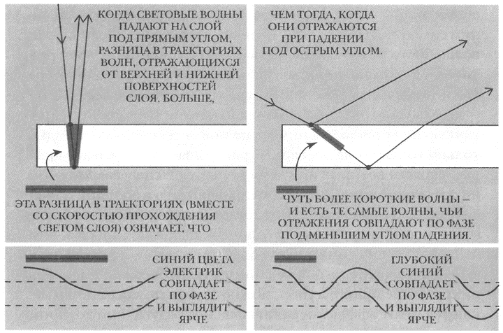 У волн синего спектра отражения от верхней и нижней частей слоя совпадают по фазе — цвет усиливается. У более длинных волн красного спектра отражения по фазе не совпадают — цвет тускнеет