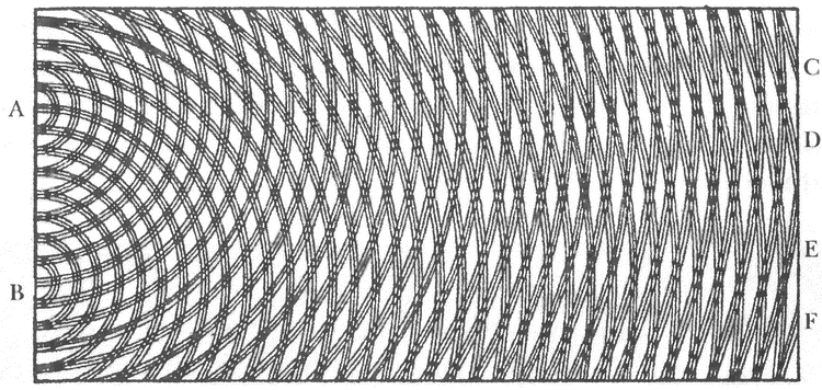 Юнг считал, что схема наглядно объясняет поведение не только водной ряби, но и солнечного луча, проходящего через две прорези экрана (отмеченные буквами А и В) и выходящего в виде волн. Свет, имея волновую природу, должен расходиться от каждой прорези на манер волн, проходящих через узкую щель дамбы; такое свойство волны, дифракция, хорошо известно. Юнг предположил: если свет является волной, тогда выходящие из обеих прорезей и накладывающиеся лучи должны интерферировать друг с другом — как и волны в воде. Только в случае со светом вместо участков более или менее спокойной воды должны проявиться участки большей и меньшей освещенности. Область особо заметного волнения в случае со световыми волнами будет областью особенно яркого освещения; область менее заметного волнения будет областью менее освещенной. Именно такое заключение, утверждал Юнг, позволил сделать опыт с экраном. В ходе опыта лучи, наложившись, образовали следующую картину:[64]