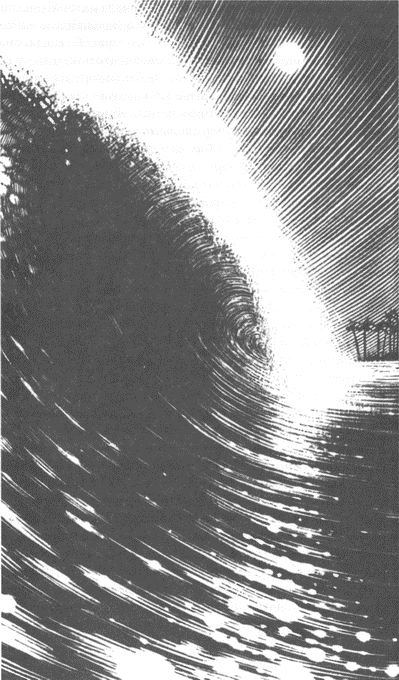 Глядя на одинаковые длины волн круговой ряби, я понял, что мотыльки пытаются махать крыльями с одинаковой частотой. В какой-то момент мотыльки оказались совсем близко друг к другу: волны ряби, сочетаясь, образовали явление довольно эффектное — интерференцию. Расходясь от попавших в западню насекомых, волны образовывали определенный рисунок из линий, расходящихся лучами. Линии расходились в промежутках между волнами, а вдоль промежутков две группы волн либо складывались, образуя особенно крупную рябь, либо нейтрализовали друг друга. Вода выглядела так, как показано на рисунке на следующей странице.