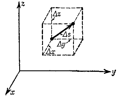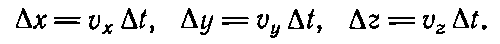 Тогда за малый промежуток времени ?t оно пройдет некоторое расстояние ?x в направлении оси x, ?y в направлении оси y и ?z в направлении оси z. Результатом же этих изменений координат будет перемещение ?s вдоль диагонали параллелепипеда со сторонами ?x, ?y, ?z, которые следующим образом связаны с составляющими скорости и интервалом: