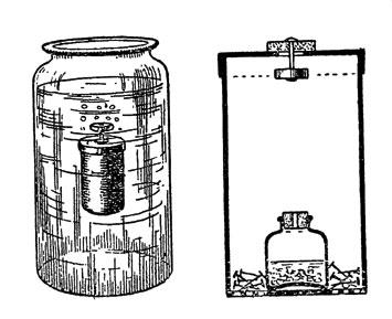 "В большую стеклянную банку с водой опустите дном вниз готовую и закрытую коробочку; вода будет входить в нее через нижние отверстия, а воздух выходит сверху через клапан, и коробочка опустится в воду. Но вот начинает работать газовый двигатель: в пузырек попадает немного воды, смачивает порошок, и из него сейчас же выделяется в большом количестве углекислый газ, который наполняет коробочку и вытесняет из нее воду через отверстия в дне: при этом все время, пока коробочка находится под водой, отверстие в крышке остается прикрытым картонным кружком клапана, потому что легкая пробка, поднимаемая давлением воды, тянет клапан кверху. Коробочка, наполненная газом, снова всплывает вверх; первою показывается из воды пробка, клапан опускается под действием веса пробки, газ выходит наружу, и вода снова наполняет коробку. Прибор опять опускается на дно, пока новое количество воды не попадает в скрытый внутри пузырек".