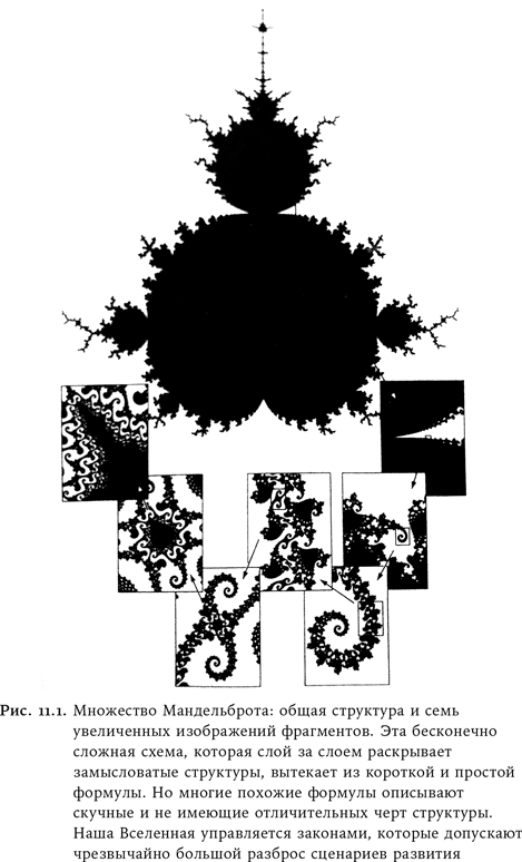 Замысловатая структура нашей Вселенной выросла из простых законов, которые, однако, совершенно не гарантируют сложные последствия; мы видели, что различные варианты наших шести чисел привели бы к скучным и стерильным вселенным. Подобным же образом математические формулы могут приводить к очень ярким результатам, но чаще всего этого не происходит. Например, множество Мандельброта со всей его бесконечной глубиной витиеватой структуры выводится из простой формулы (см. рис. 11.1), но другие формулы, на первый взгляд похожие, создают очень скучные графики.