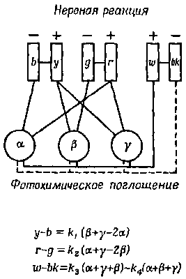Тот факт, что существуют три сорта пигментов, вовсе не означает, что должно быть также три сорта ощущений. Существует теория цветового зрения, основанная на совершенно противоположной цветовой схеме (фиг. 36.2).