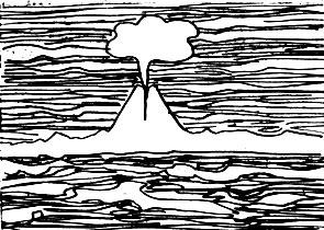 Изучаются Этна, Везувий, вулканы Японии, Индонезии, Гавайских островов и т. д. В результате исследований установлено, что очаги извержений обычно располагаются на глубине 8-10 км (рис. 16), где находятся камеры, содержащие расплавленную магму. Магма поступает в них из зон, расположенных на глубине более 30 км. На рисунке видно, как вулканический канал пересекает породы палеозоя, мезозоя и кайнозоя.