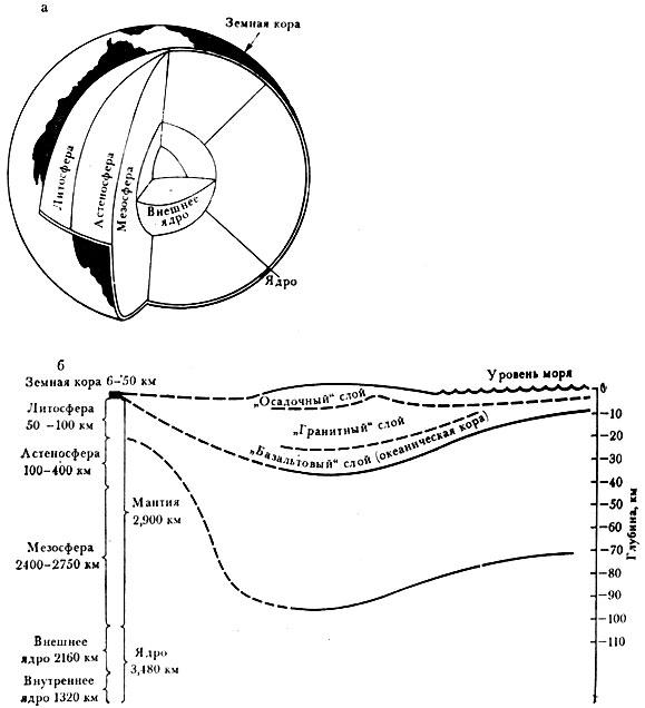 Рис. 8. Строение Земли а - концентрические оболочки Земли; б - земная кора, континентальная и океаническая, и литосфера