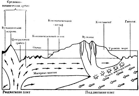Рис. 11. Раздвигание и поддвигание континентальных плит