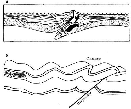 Рис. 12. Деформации осадочных пород. Деформации: а - в мелком масштабе при поддвигании литосферных плит (черным - магматические породы); б - в крупном масштабе