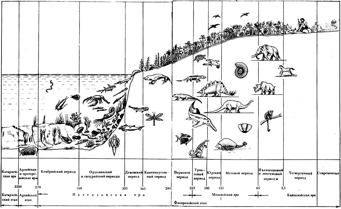 Фанерозойский этап, продолжающийся в течение последних 570 млн. лет, характеризовался дальнейшим развитием жизни на Земле, сопровождающимся расцветом и массовым вымиранием отдельных групп животных и растений, появлением и развитием наземных форм (см. рис. 13). На "взлеты" и "падения" в развитии отдельных групп организмов влияло изменение глобальных физико-географических условий, определяемых отчасти распространением морей и океанов. В одни геологические периоды и эпохи (например в кембрийский, позднедевонскую, позднеюрскую и другие эпохи) значительная часть планеты была покрыта мелководными морями, в теплой воде которых бурно развивались водоросли и различные животные (трилобиты, брахиоподы, граптолиты и др.), в другие (например в каменноугольный, раннеюрскую, раннемеловую и другие эпохи) в условиях влажного и теплого климата почти все континенты были покрыты пышной растительностью, сначала преимущественно папоротниковых, а затем и других видов, остатки которых, захороняясь, образовали впоследствии мощные пласты ископаемых углей (Донецкий, Кузнецкий, Рурский и другие угольные бассейны). Наконец, в истории Земли существовали эпохи (раннедевонская, раннепермская и др.) весьма жаркого климата, в течение которых из воды многих заливов и морей выпадали соли и накапливались на дне таких бассейнов в виде мощных толщ (районы Солегорека, Соликамска, Артемовска в Донбассе и др.).