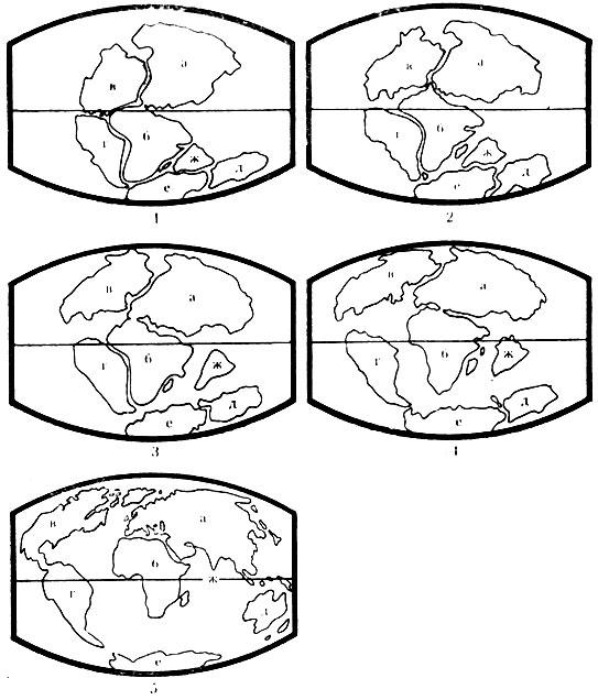 Рис. 14. Положение континентов в разные периоды фанерозоя: 1 - пермский (225 млн. лет назад); 2 - триасовый (200 млн. лет назад); 3 - юрский (135 млн. лет назад); 4 - меловой (65 млн. лет назад); 5 - современное положение Континенты: а - Евразийский; б - Африканский; в - Северо-Американский; г - Южно-Американский; д - Австралийский; е - Антарктический; ж - Индийский субконтинент