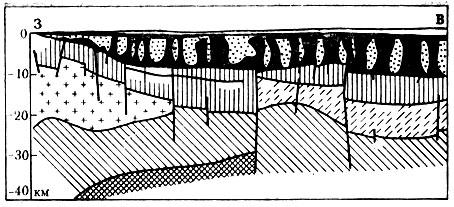 Рис. 9. Условия образования магматических пород. Черным показаны магматические породы; остальными условными знаками различные осадочные породы