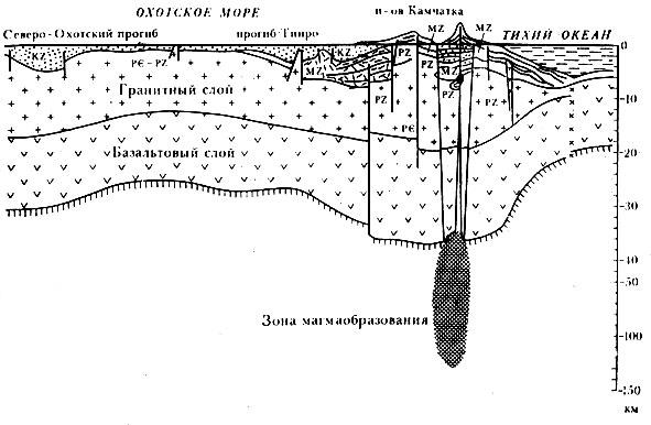 Рис. 16. Глубинное строение района Камчатки РЭ - докембрий, PZ - палеозой, MZ - мезозой, KZ - кайнозой