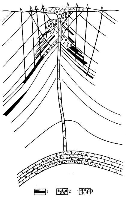 Рис. 17. Предполагаемый геологический разрез через грязевой вулкан Люк- Батан Залежи: 1 - нефти, 2 - газа, 3 - сопочная брекчия исследует