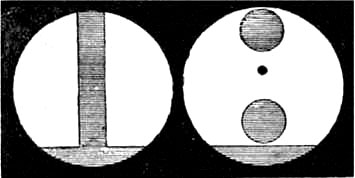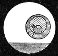 Теперь мне хотелось бы показать вам, пользуясь готовым прибором, как внутри керосиновой смеси вы можете выдуть пузыри из воды, и некоторые из них, как вы увидите, будут содержать другие пузыри и капли из той или иной жидкости. Одна из таких пузыревидных капель остановилась теперь в покое над более тяжелым слоем жидкости, что дает вам возможность рассмотреть ее наилучшим образом (рис. 34).