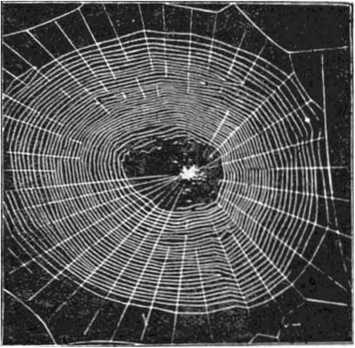 Показав, что очень большой жидкий цилиндр разбивается на капли, я перейду теперь к другой край- кости и возьму для примера чрезвычайно маленький цилиндр. Вот перед вами фотографический снимок паука в его геометрически правильных тенетах (рис. 35).