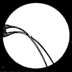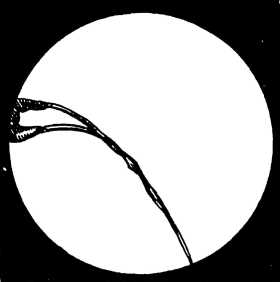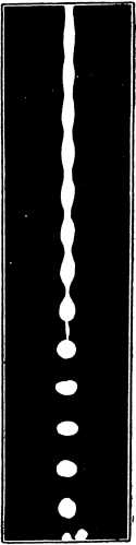 Сначала струя представляет собою цилиндр, который по мере падения вниз начинает образовывать перетяжки и утолщения и, наконец, отделять капли, которые вы хорошо можете рассмотреть. Капли эти вибрируют, то удлиняясь, то расширяясь, и не может быть никакого сомнения, что сверкающая часть струи, хотя и кажется непрерывной, в действительности состоит из отдельных капель, которые пролетают так быстро, что наш глаз не в состоянии уследить за ними. (Должен добавить, что по причине, которая уяснится впоследствии, в момент фотографирования струи я произвел громкий звук, свистя в этот ключ.)