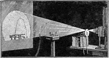 А теперь приступим к опыту. Вот тут у нас электрический фонарь, посылающий на экран сильный пучок света. При помощи чечевицы я собираю пучок света в фокусе, а затем пропускаю его через маленькое отверстие в куске картона. Свет расходится широким конусом и падает на экран. Фонтан воды помещается между картоном и экраном, и таким образом на экран отбрасывается довольно явственная тень. Теперь я помещаю непосредственно позади куска картона маленький электродвигатель, с помощью которого можно привести в очень быстрое вращение диск картона с шестью отверстиями, расположенными по самому его краю. Отверстия диска приходятся по очереди против единственного отверстия в неподвижном куске картона, и таким образом при каждом полном обороте диска у нас получится шесть вспышек света. Когда диск будет обращаться 21 1/3 раза в секунду, тогда вспышки света будут следовать одна за другой с надлежащей частотой. Я пускаю мотор и через несколько секунд получаю надлежащую скорость. Убедиться в этом я могу, продувая воздух через отверстия: получающийся при этом музыкальный звук будет большей высоты, чем у камертона, если скорость слишком велика, меньшей высоты, чем у камертона, если скорость слишком мала, и совершенно такой же высоты, как у камертона, когда скорость как раз такая, какая нам нужна.