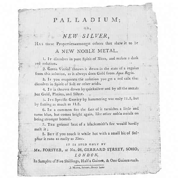 В апреле 1803 г. в одном антикварном магазине в Сохо в продаже появилось небольшое количество блестящего металла. В рекламном листке, анонимно распространявшемся среди лондонских ученых, провозглашалось, что это «палладиум, или новое серебро» и что они видят перед собой «новый благородный металл». Далее подробно описывались характеристики металла: к примеру, «сильнейший жар кузнечного горна вряд ли способен его расплавить» и тем не менее, «если вы поднесете к нему в раскаленном состоянии небольшой кусочек серы, он потечет так же свободно, как цинк».