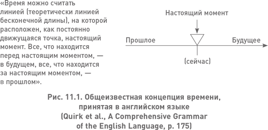 Мы увидим, что течения времени не существует. Тем не менее такое представление совершенно обыденно. Мы принимаем это как должное настолько, что это принимается в самой структуре нашего языка. В «Полной грамматике английского языка» (A Comprehensive Grammar of the English Language) Рэндольф Квирк и его соавторы объясняют концепцию времени с помощью диаграммы, показанной на рис. 11.1. Каждая точка на линии представляет конкретный стационарный момент. Треугольник «?» показывает, где на линии расположена «непрерывно движущаяся точка, настоящий момент». Считается, что она движется слева направо. Некоторые люди, как Шекспир в процитированном выше сонете, считают определённые события «фиксированными», а саму линию — движущейся мимо них (справа налево на рис. 11.1), так что моменты из будущего проносятся мимо настоящего момента, чтобы стать прошлыми моментами.