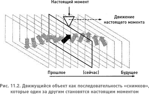 Рассмотрим снова рис. 11.2. Он иллюстрирует движение двух сущностей. Одна из них — это вращающаяся стрелка, показанная в виде последовательности снимков. Другой — движущийся «настоящий момент», который перемещается по картинке слева направо. Однако движение настоящего момента не показано на картинке в виде последовательности снимков. Вместо этого один конкретный момент выделен с помощью знака «?», более тёмных линий и единственной надписи «(сейчас)». Таким образом, хотя надпись гласит, что «сейчас» движется по картинке, показан только один его снимок, в один конкретный момент.