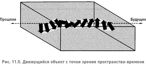 В физике Ньютона эта четырёхмерная геометрическая интерпретация времени была необязательной, но с появлением теории относительности Эйнштейна она стала неотъемлемой частью этой теории. Так произошло потому, что в соответствии с теорией относительности наблюдатели, которые движутся с разными скоростями, не придут к согласию относительно того, какие события являются одновременными. Иначе говоря, они не придут к согласию относительно того, какие события должны появиться на одном и том же снимке. Таким образом, каждый из них воспринимает пространство-время как разрезанное на «моменты» различным образом. Тем не менее, если бы каждый из них собрал свои снимки, как показано на рис. 11.4, получились бы идентичные пространства-времена. Следовательно, в соответствии с теорией относительности «моменты», изображённые на рис. 11.4, не являются объективными характеристиками пространства-времени: они являются всего лишь способом восприятия одновременности одним наблюдателем. Другой наблюдатель получил бы слои «сейчас» под другим углом. Таким образом, объективную реальность, стоящую за рис. 11.4, а именно пространство-время и его физическое содержание, можно было бы показать с помощью рис. 11.5.