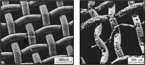 Рис. 34. Металлическая сетка фильтрующего элемента: до (слева) и после (справа) коррозии