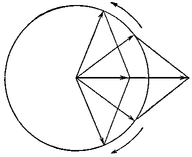 Фиг. 33.8. Два вектора одной длины, вращающиеся в противоположные стороны, дают при сложении вектор, направление которого не меняется, а амплитуда осциллирует.