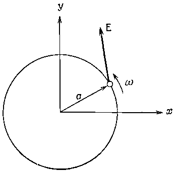 Свет с круговой поляризацией обладает интересным свойством — он переносит момент количества движения (взятый относительно направления луча). Чтобы пояснить это утверждение, предположим, что поляризованный по кругу свет падает на атом, который представляет собой гармонический осциллятор, способный колебаться в любом направлении в плоскости ху. Тогда смещение электрона по оси х отвечает компоненте поля Еx, а смещение по оси у отвечает компоненте Еу, равной по величине, но отстающей по фазе на 90°. Это означает, что электрон под действием вращающего электрического поля световой волны (фиг. 33.9) будет двигаться по окружности с угловой скоростью ?.