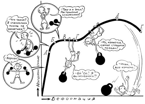 «Материал „течет“», — говорят инженеры. Он словно бы потерял способность сопротивляться нагрузке. И вдруг течение металла прекращается. Металл, будто устыдившись своего малодушия, обретает новые силы для сопротивления. Нет, он не сдается так просто, он еще поборется! Линия, вычерчиваемая самописцем, снова поворачивает вверх (Г — Д). Перо выписывает сложный зигзаг, который становится все отложе, и…