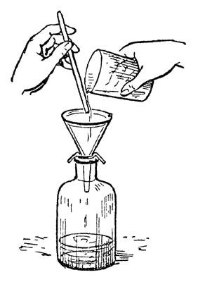 Вырезав кружок фильтровальной бумаги так, чтобы его радиус был несколько меньше, чем образующая конуса[39] воронки, складывают его вчетверо по двум взаимно перпендикулярным диаметрам. Для более быстрого фильтрования кружок складывают наподобие бумажного веера. Горячие жидкости фильтруются скорее холодных, но в первые моменты осадок при этом проходит сквозь фильтр, так что фильтрат (процеженный раствор) приходится при этом сливать обратно в воронку. Фильтр должен плотно прилегать к стенкам воронки, что достигается пропусканием через фильтр до начала фильтрования небольшого количества горячей воды. Фильтруемую жидкость, раньше чем слить в воронку, надо хорошенько взболтать. Сливают взболтанный раствор по стеклянной палочке (рис. 57).