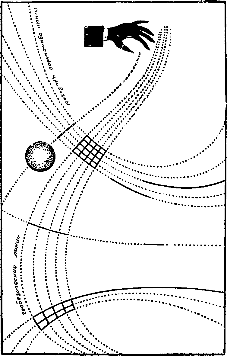 Тела, летящие по инерции, движутся не по прямым линиям несуществующего ньютоновского абсолютного пространства. Мировые линии их располагаются не по прямым упрощенного мира частной теории относительности, лишенного тяготения. В общем случае тела, летящие по инерции, следуют геодезическим линиям реального искривленного пространства — времени. Толкните камень, уроните его, подбросьте — его движение изобразится четырехмерной геодезической линией, которая располагается на диаграмме поперек линий одинаковой кривизны пространства — времени. Там, где геодезическая искривится, камень приобретет ускорение. Причем сам, без всяких усилий, приложенных со стороны. Ибо такой путь на диаграмме будет для него наиболее прямым.