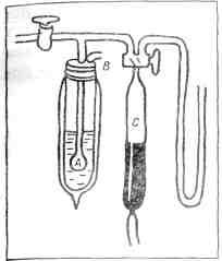 Рис. 12. Прибор Рамзая для сжижения аргона. В газометре С находится ртуть, а над нею аргон. Если открыть кран, аргон потечет по трубке в стеклянный шар А, погруженный в дьюар с жидким воздухом. Трубка В устроена для того, чтобы жидкий воздух, испаряясь и превращаясь в газообразный, свободно уходил в атмосферу. (Если бы трубки В не было, то при испарении жидкого воздуха давление в дьюаре возрастало бы непрестанно и в конце концов дьюар разорвался бы на куски)