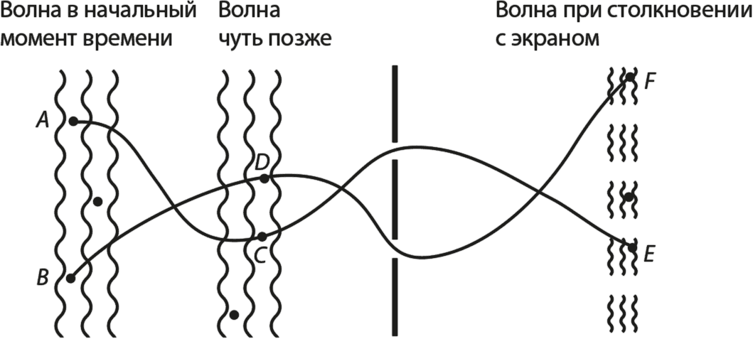 Рис. 3.1. Как волна, описывающая поведение электрона, движется от источника к экрану и как ее нужно интерпретировать в качестве представления всех вариантов траекторий электрона. Пути от A до C и E и от B до D и F иллюстрируют всего лишь две из бесконечного множества траекторий, по которым может двигаться одиночный электрон