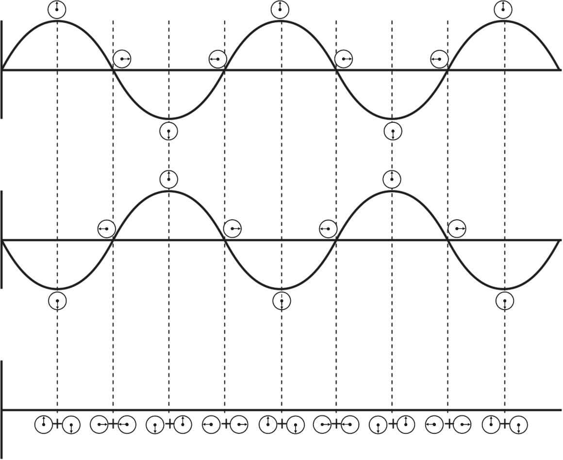 Две волны на рис. 3.3 находятся в противофазе, то есть максимумам верхней волны соответствуют минимумы нижней волны, и наоборот. В результате, разумеется, они при сложении полностью погасят друг друга. Это показано в нижней части рисунка, где волна становится совершенно прямолинейной. Если говорить о циферблатах, то все 12-часовые циферблаты верхней волны, отображающие ее пики, соответствуют 6-часовым циферблатам нижней волны, отображающим ее минимумы. Собственно, везде стрелки на циферблатах верхней волны указывают в сторону, противоположную циферблатам нижней волны.