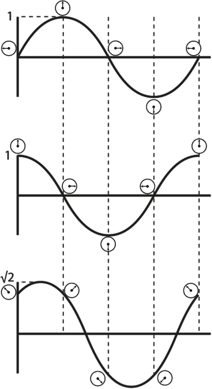 Теперь вернемся вновь к рис. 3.4. Для любой точки на маршруте новой волны мы можем вычислить высоту волны, сложив циферблаты по приведенному выше правилу и задавшись вопросом, насколько стрелка нового циферблата близка к 12-часовому направлению. Когда стрелка указывает на 12, все очевидно: высота волны попросту равна длине стрелки. Точно так же, когда стрелка направлена на 6, все очевидно: волна находится на минимуме, и ее глубина равна длине стрелки. Все понятно и в том случае, когда на часах 3 или 9, потому что высота волны равна нулю, ведь стрелка часов находится под прямым углом к 12-часовому направлению. Чтобы вычислить высоту волны, которую описывает тот или иной циферблат, нужно умножить длину стрелки h на косинус угла, который эта стрелка образует с направлением на 12 часов. Например, угол, который образуют направления на 3 и на 12 часов, равен 90°, а cos 90° равен нулю, так что высота волны тоже равна нулю. Половина второго соответствует углу в 45°, а cos 45° – примерно 0,707, так что высота волны составляет 0,707 от длины стрелки (заметьте, что 0,707 – это 1 / ?2!). Если ваших познаний в тригонометрии недостаточно, чтобы понять несколько последних предложений, можно смело игнорировать эти подробности. Важен принцип: зная длину стрелки часов и ее направление, вы можете вычислить высоту волны – и даже если не понимаете тригонометрию, легко справитесь, тщательно нарисовав стрелки часов и спроецировав их на 12-часовое направление с помощью чертежной линейки. (Здесь мы хотели бы уточнить, что всем читающим эту книгу студентам такой способ действий не рекомендуется: синусы и косинусы знать полезно.)