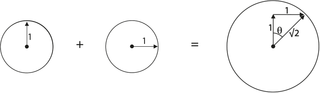 Теперь можно добиться большей точности и с помощью простой тригонометрии вычислить результаты сложения любой конкретной пары циферблатов. На рис. 3.5 мы складываем 12-часовой и 3-часовой циферблаты. Допустим, длина стрелок двух первых циферблатов – 1 см (что соответствует максимальной высоте волны – 1 см). Когда мы сводим стрелки головкой к хвосту, получается прямоугольный треугольник, две стороны которого имеют длину 1 см каждая. Стрелка нового циферблата будет иметь длину третьей стороны треугольника – гипотенузы. Теорема Пифагора гласит, что квадрат гипотенузы равен сумме квадратов катетов: h? = x? + y?. Подставляем числа: h? = 1? + 1? = 2. Итак, длина новой стрелки циферблата h будет равняться квадратному корню из 2, то есть примерно 1,414 см. В каком направлении будет указывать эта новая стрелка? Для этого нужно узнать величину угла треугольника, отмеченного на рисунке буквой ?. В нашем примере, когда две стрелки одинаковой длины, одна из которых указывает на 12, а другая на 3, можно найти ответ и без всякой тригонометрии. Очевидно, что гипотенуза образует угол 45°, так что новое «время» будет находиться между 12 и 3 часами – это половина второго. Конечно, такой пример – особенный случай. Мы выбрали такие циферблаты, чтобы их стрелки располагались под прямыми углами и имели одинаковую длину, а это упрощает математику. Но очевидно, что можно вычислить длину стрелки и получающееся время при сложении любой пары циферблатов.