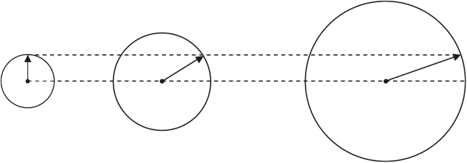 Вот почему использование циферблатов не так уж необходимо при описании водяных волн. Взгляните на три циферблата на рис. 3.6: все они соответствуют одной и той же высоте волны и дают эквивалентные способы представления одной и той же высоты воды. Но циферблаты эти, разумеется, различны, и, как мы увидим, эти различия имеют значение, если использовать их для описания квантовых частиц, потому что в этом случае длина стрелки циферблата (или размер циферблата, что одно и то же) имеют очень важное истолкование.