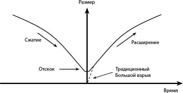 Возможны и менее абстрактные подходы к пониманию того, что, возможно, было до Большого взрыва. Самая очевидная стратегия — заменить Взрыв определенного рода отскоком. Представим себе, что Вселенная до того события, которое мы называем Большим взрывом, в действительности сжималась и становилась более плотной. Но вместо того чтобы скатиться в сингулярность Большого сжатия, Вселенная — каким-то образом — отскочила в фазу расширения; этот отскок мы и принимаем за Большой взрыв.