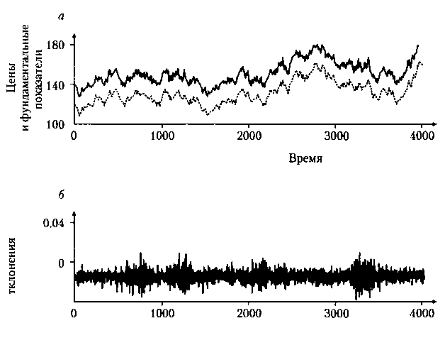 Рис. 9.1. Экономическая модель Люкса и Марчези демонстрирует, каким образом случайные изменения фундаментальных показателей, определяющих изменения цен, приобретают «неслучайный» характер в изменениях цен из-за взаимодействия торговых агентов .Долгосрочные колебания цен (сплошная линия) параллельны колебаниям фундаментальных показателей (пунктирная линия), демонстрируя разумность и правдоподобность модели (а). С другой стороны, краткосрочные колебания имеют негауссовское распределение (6), и соответствующие флуктуации не являются случайными, так как им соответствуют слишком сильные выбросы.